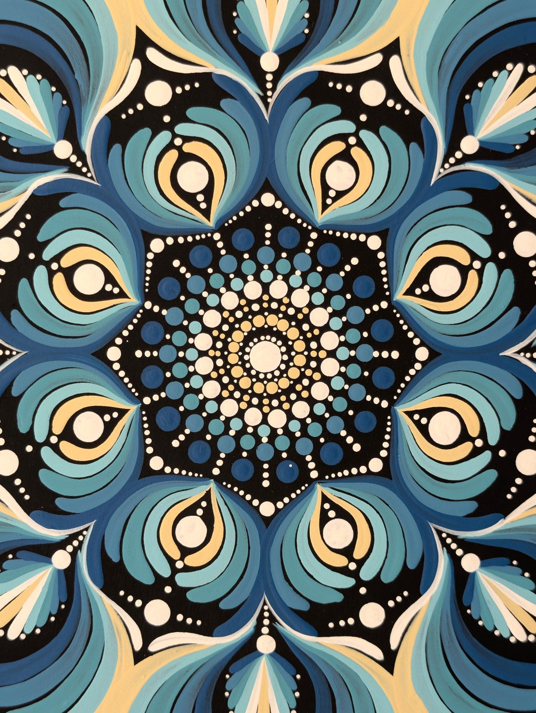 Il mandala è stato trattato in superfice con una vernice per renderlo resistente ai raggi UV, proteggerlo e non far ingiallire i colori. Sul retro è stato applicato un gancio per poterlo appendere con facilità.