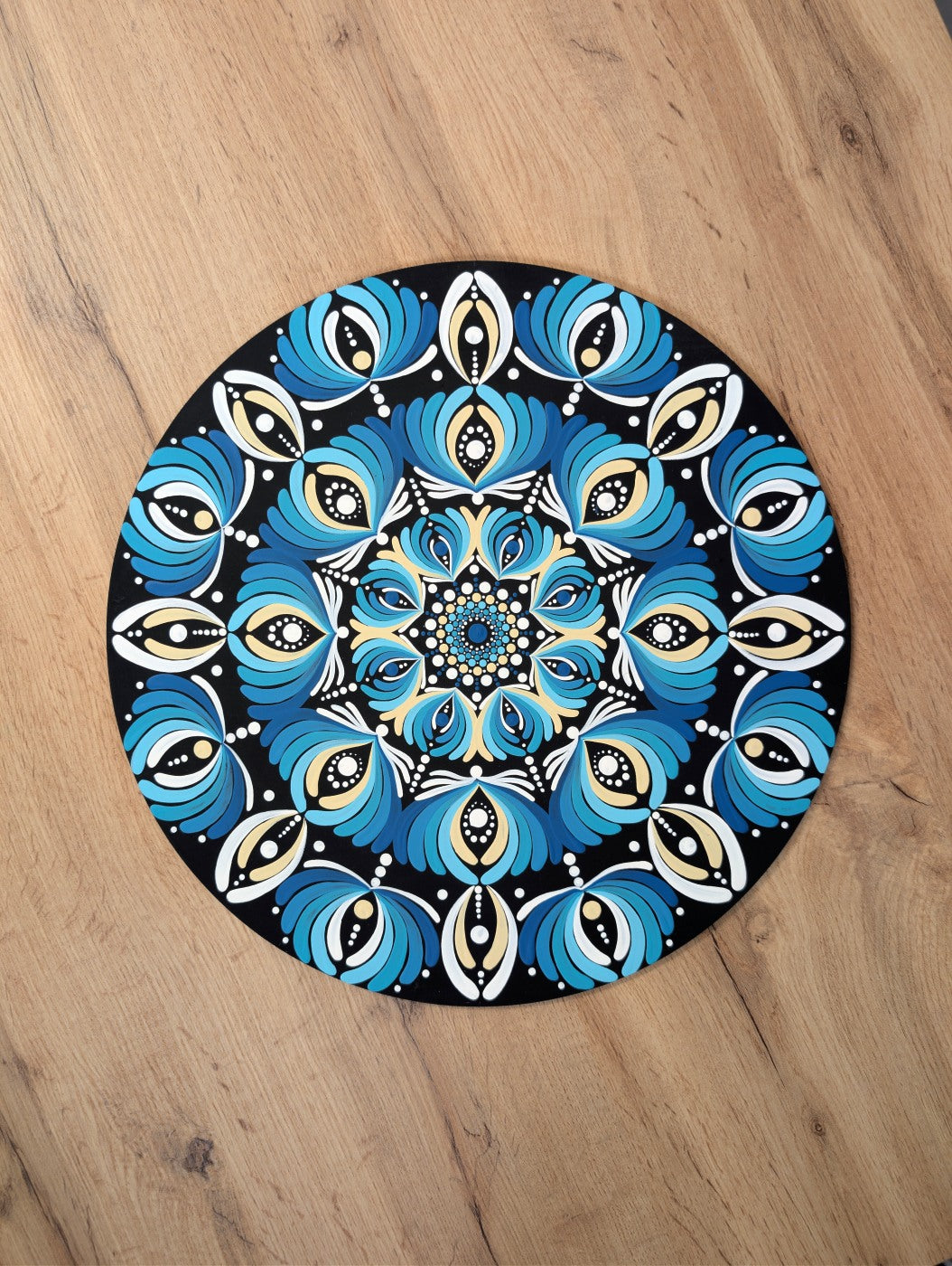 Il mandala è stato trattato in superfice con una vernice per renderlo resistente ai raggi UV, proteggerlo e non far ingiallire i colori. Sul retro è stato applicato un gancio per poterlo appendere con facilità.