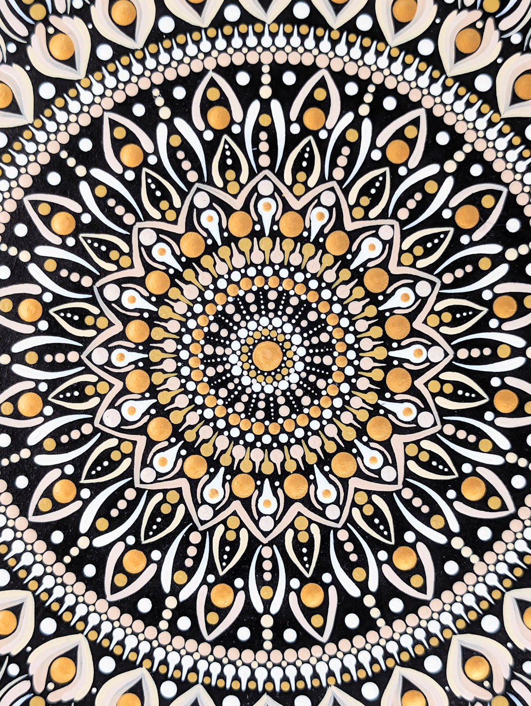 Il mandala è stato trattato in superfice con una vernice per renderlo resistente ai raggi UV, proteggerlo e non far ingiallire i colori. Sul retro è stato applicato un gancio per poterlo appendere con facilità.